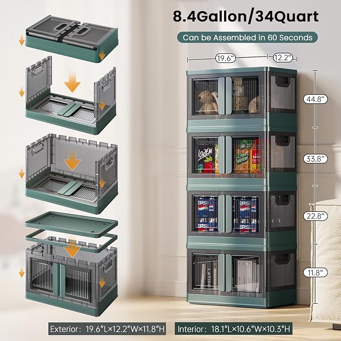 8.4Gal Collapsible Storage Bins with Lids & Wheels - 4 Pack Stackable with Doors, Heavy-Duty Plastic Containers for Home/Office, Green