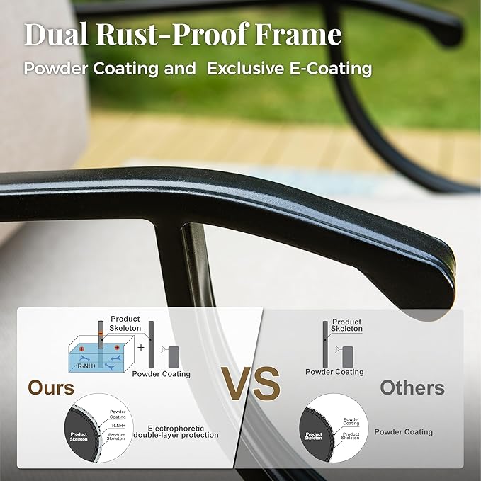 - 【RELIABLE ALL-WEATHER METAL CONSTRUCTION】Built from durable metal with E-COATING and POWDER-COATING finish, ensuring resistance to all weather conditions, rust-proof qualities, and easy maintenance. The sturdy wrought iron frame can withstand various weather conditions, with the single chairs supporting up to 350 lbs and the 3-seater sofa accommodating up to 900 lbs, promising long-lasting reliability and durability.