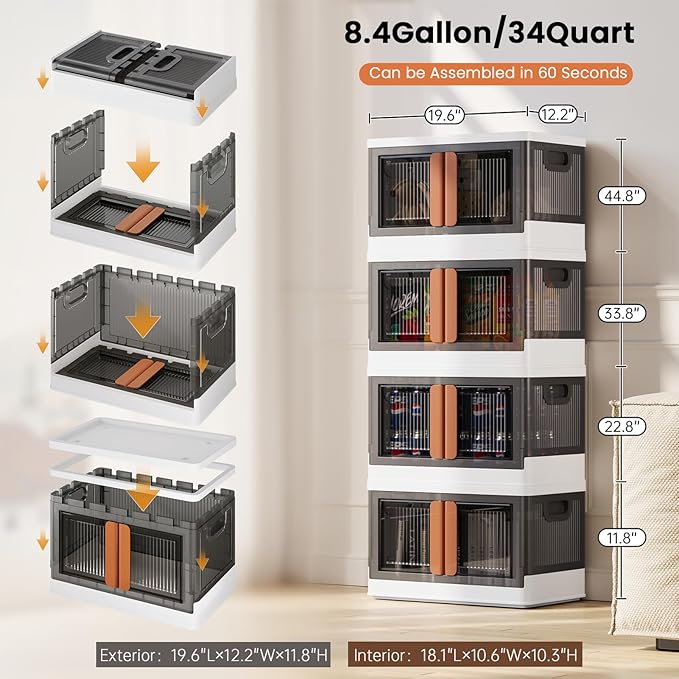 8.4Gal Collapsible Storage Bins with Lids & Wheels - 4 Pack Stackable with Doors, Heavy-Duty Plastic Containers for Home/Office, White
