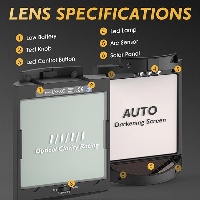 - Extra-large view area:Auto darkening welding helmet with a main viewing area of 4.31" x 3.81" (16.4 square inch) and side screens (no auto-darkening), ideal for welding,cutting and grinding