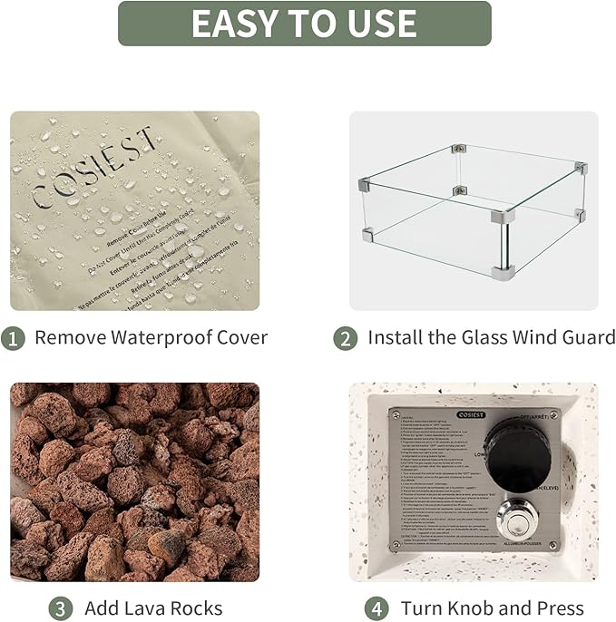 - ð¥ãSpread the Glowã: Natural red lava pieces fill the burner bowl and help radiate the warmth more evenly as they are heated by the flames. No soot or ash to clean up and no smoke as with wood burning or charcoal fires. Clean burning propane stays lit with no stoking and is better for the environment. The fire pit table also comes with a waterproof cover to keep it clean and dry when not in use,wind guard keep the flames steady.