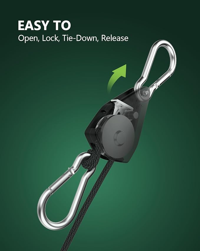 2-Pack 1/8” Adjustable Rope Hanger, Heavy Duty Ratchet Tie Down Strap with Reinforced Metal Gear, Ratcheting Pulley System Bungee Cord for Hanging Plants Grow Light and Various Tie-Down Uses