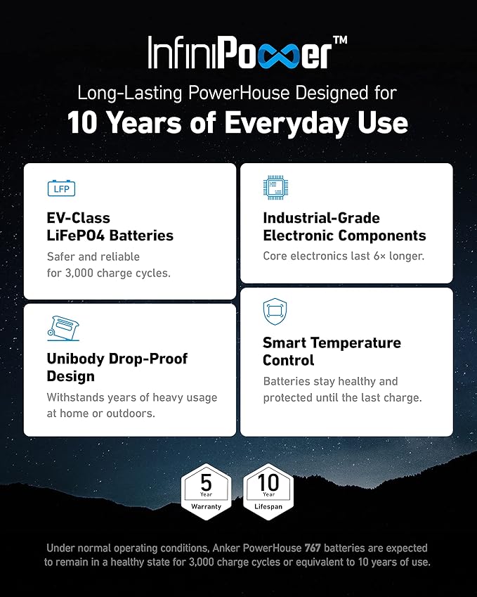 - Long-Lasting Portable Power Station With a 10-Year Lifespan: With our proprietary long-lasting technology InfiniPower, combined with LiFePO4 batteries, ultra-durable electronic components, a smart temperature control system that monitors temperature up to 100 times per second, and impact-resistant structural design,Anker SOLIX F2000 is built to last over a decade, even with everyday use.