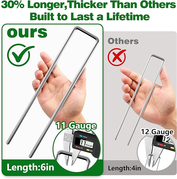 - 🌞Material:Our landscape pins are made of heavy-duty hot-dip galvanized steel,11-gauge thickness,30% thicker than ordinary stakes,ensuring they won’t bend even when hammered into hard soil or gravel.