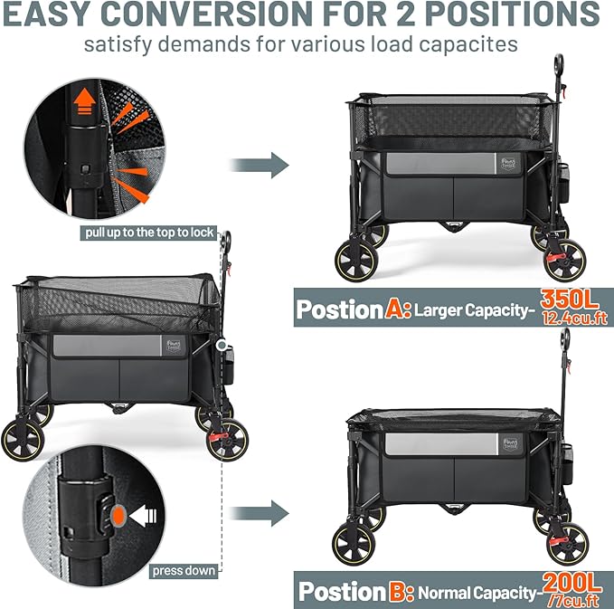 - 350L LARGE CAPACITY: The outdoor wagon is height-adjustable, facilitating access and preventing items from falling; unfolded dimensions: 35 1/2"L x 19"W x 30"H, folded: 12"L x 8"W x 30"H
