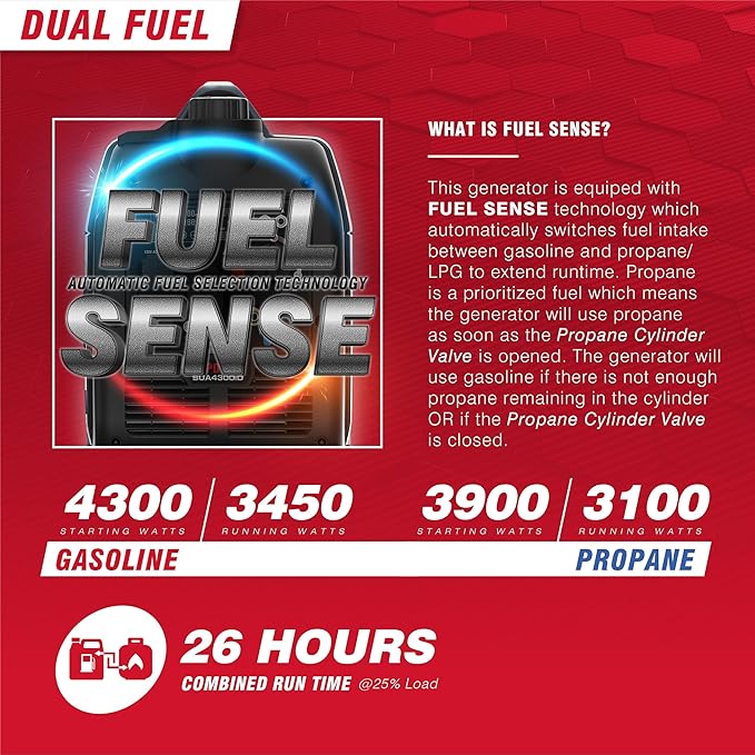 - Fuel Sense Technology: Runs on gasoline or propane fuel giving you great flexibility during an emergency. Equipped with fuel sense technology, automatically switches from LPG to Gas for a combined run time of up to 26 hrs at 25% load.