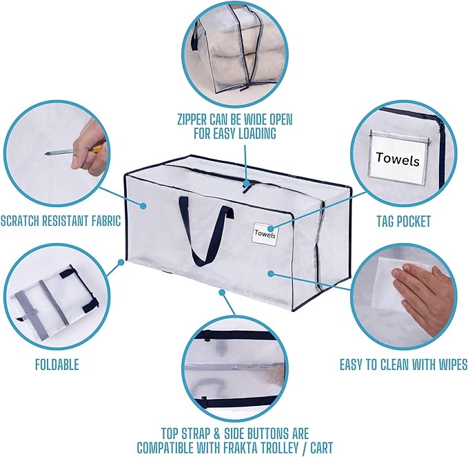 - Clear Tag Pocket & Wide Opening – Say goodbye to the frustration of searching for your belongings. Make a custom label and insert it into the clear tag pocket for easy identification of items like blankets, bedding, pillows, and clothes. Remember to use this labeling feature for organizing college dorm room essentials, moving to a new home, or storing items in the garage. The bag is equipped with dual extended zippers, creating a wide opening that allows for effortless access to stored items.