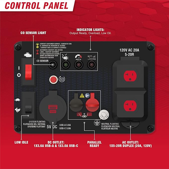 - Included Components : CO sensor with auto shutdown technology, a parallel cable, a fully loaded control panel with CO sensor indicator light, data indicator lights, 1x Duplex 5-20R 20A 120VAC, 1x 3.6A USB-A, 1x 3.0A USB-C, Parallel Capable CO sensor with auto shutdown technology, a parallel cable, a fully loaded control panel with CO sensor indicator light, data indicator lights, 1x Duplex 5-20R 20A 120VAC, 1x 3.6A USB-A, 1x 3.0A USB… See more