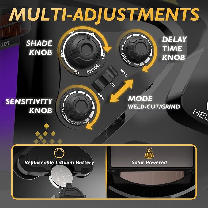 - Large view area:Auto darkening welding helmet with 3.94" x 3.66" (14.4 square inch) viewing area and 4 arc sensors,improve MIG or TIG welding efficiency