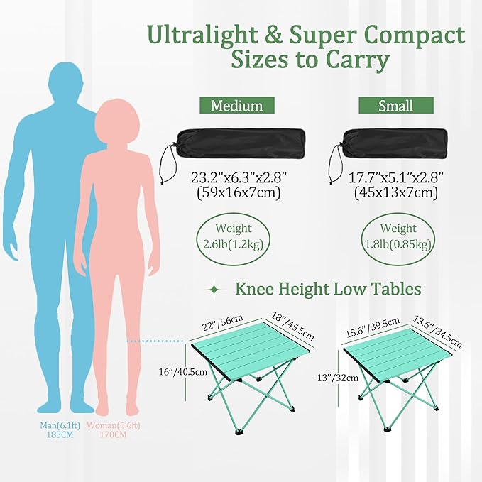 - Ultra lightweight and easy to carry - Our folding camping table has an aluminum tabletop and frame, so it is lighter than another wooden camping table of the same size, with a weight (Small: 1.85 pounds / Medium: 2.6 pounds / Large: 3.3 pounds) that is lightweight enough to carry. It can be folded into the accompanying handbag, placed in a backpack, or placed anywhere needed. The small camping table provides a stable working platform for amateur enthusiasts. This portable camping table is the perfect companion for portable camping chairs or folding stools. You can even use it as a folding beach table, or a tent table sitting on a beach mat or camping mat.