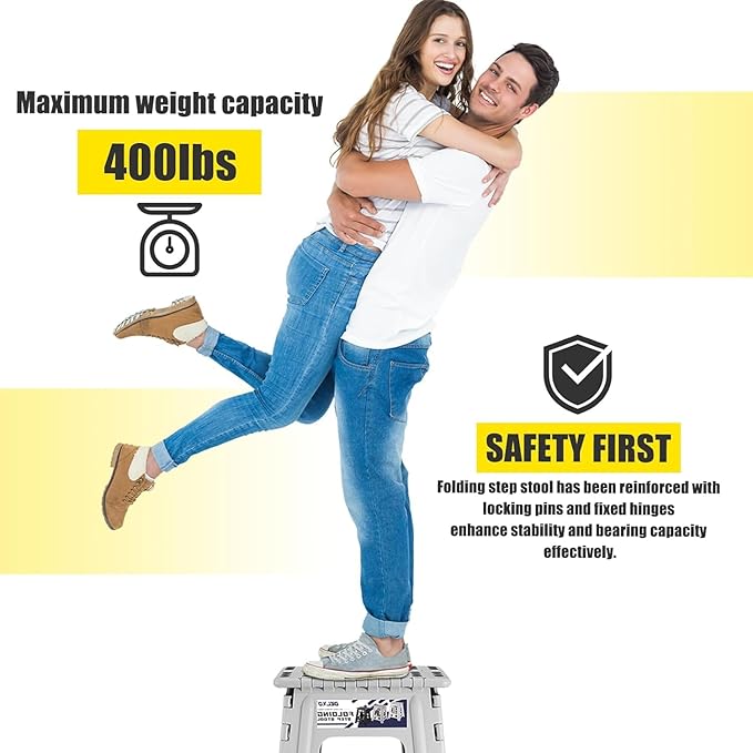 - Anti Slip : Rubber grips on the surface and anti-slip rubber feet on each foot create maximum grip, has amazing support and comfort. Unique grip-dot textured surface makes the folding step stool safe for everyone, including kids. These safety features make the step stool great for multipurpose uses i.e. kitchen, bathroom, dining room, office, garden, camping, fishing, and more