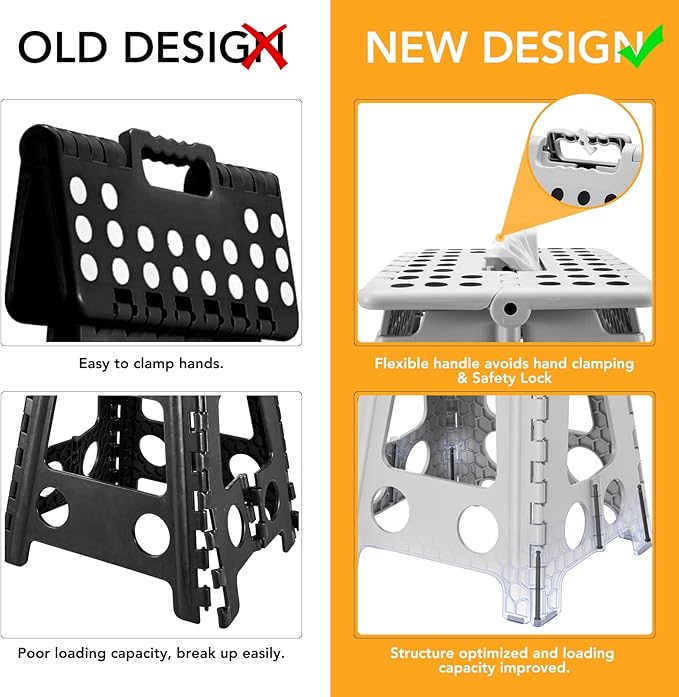 - Safe Upgrade Step Stool : Features improved the folding bar, it has been reinforced with locking pins and fixed hinges which can prevent from collapse inward while Steping on it.Delxo have designed a safety stop gap feature that allows the foldable stool to prevent being squashed, great for adults. Four round corner super safe protect your body from clashing. All of this design is put your safe first