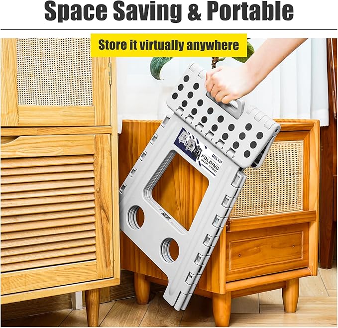 - Space Saving Foldable Stool : Delxo step stool save your closet space more than 90% when it folded up.It's quickly and easily folds away for convenient storage so you can opens with one flip of the hand.Also you can hides them in corner at home because it's so compact. Great folding stool for in the kitchen, bathroom, dining room, office, garden, camping, fishing and more.Carry this quick-fold step stool wherever you go