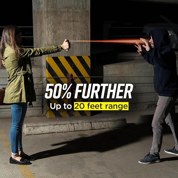 - UP TO 20-FOOT RANGE: Pepper spray offers enhanced safety features compared to traditional pepper sprays. It boasts a maximum range of up to 20 feet, delivering a potent stream of spray to deter multiple threats effectively. Unlike its counterparts, pepper spray demonstrates resistance to wind blowback, ensuring accurate deployment even in adverse conditions