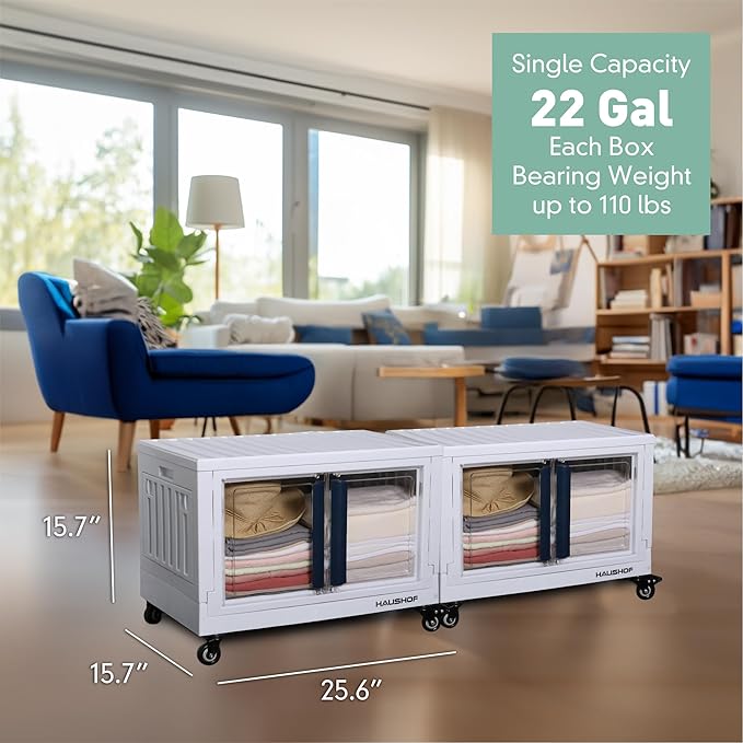 - Larger Storage Capacity: Each HAUSHOF storage bin has a capacity of 22 gallons, larger than other storage bins. Collapsible organizer dimensions: 25.6”*15.7"*15.7". With a maximum load capacity of 110 lbs (50 kg), it is sturdy enough to hold all your essentials