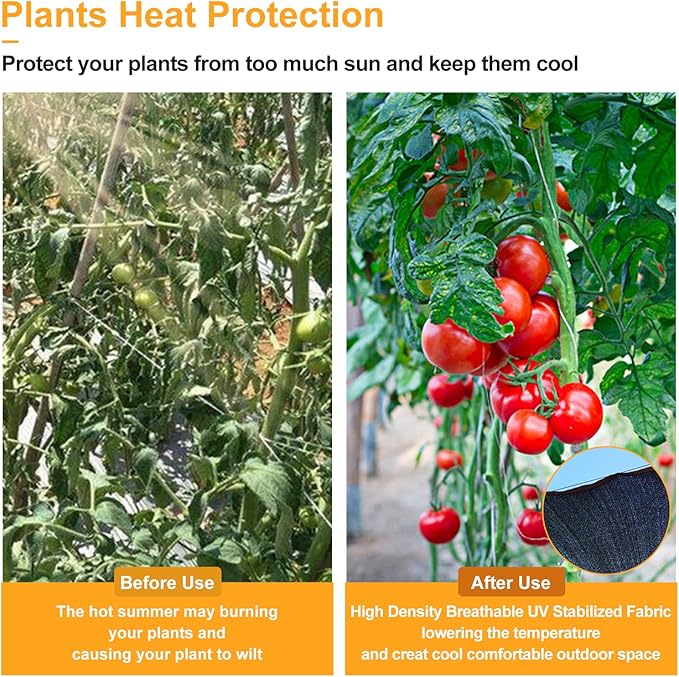 - ??0% Shade Rating - Release Heat Quickly??The 90% sun screen blocks direct sun from the outdoor area and eliminated the afternoon glare. UV protection mesh fabric blocks 90% of UV rays, lowering the temperature and creat cool comfortable outdoor space. Our sunshade cloth helps shade-loving plant or delicate vegetables survive the hot summer sun. Sun shade cloth allows an outdoor space to be 10-20 degrees cooler. It works great on pool, outdoor play areas, decks, patio, pergolas and dig kennel.