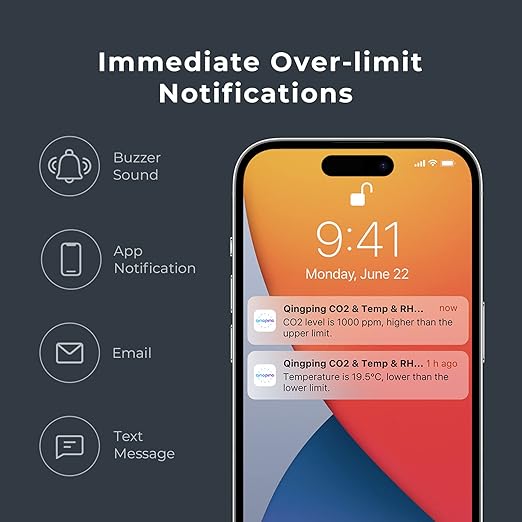- 【Multiple Alert Methods】The built-in buzzer will alarm if CO2, temperature or humidity is over-limit. You can also get alerts via app notifications, emails, and text messages. * The buzzer alarm feature can be turned off/on using the Qingping IoT app or website.