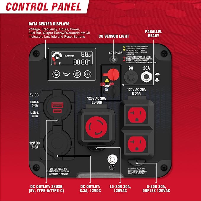 - Multi-Featured Control Panel: The control panel consists of CO sensor indicator light, LED light, data center display, 2x USB 5VDC, 1x 8.3A 12VDC, 1x L5-30R 30A 120V, 1x Duplex 5-20R 20A 120V.
