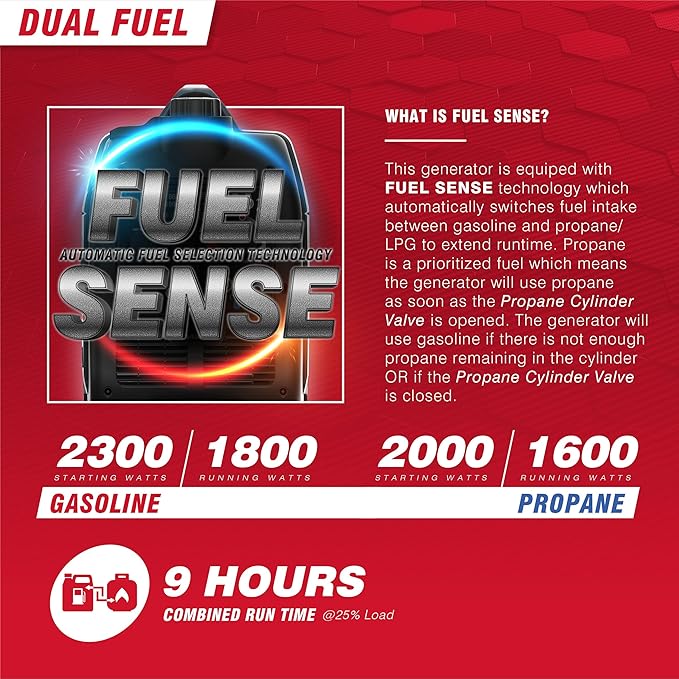 - Dual Fuel: Runs on gasoline or propane fuel giving you great flexibility during an emergency. Equipped with fuel sense technology, automatically switches from LPG to Gas for extended run time.