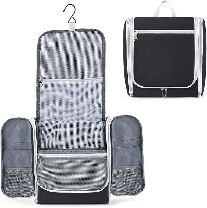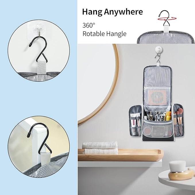 - Sturdy Metal Hooks: The sturdy hooks allow you to hang your toiletry bag on any hook, door, rod, etc. and can be rotated 360° for easy access
