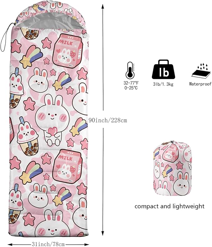 - 🌈【Fashion Design】SIZE - 31 by 90 inches (W x D). Our sleeping bag can be used in 3 seasons with a design temperature of 32℉-77℉(0℃-25℃). These bags also have a weather resistant waterproof design to keep you warm and prevent you from any dampness.