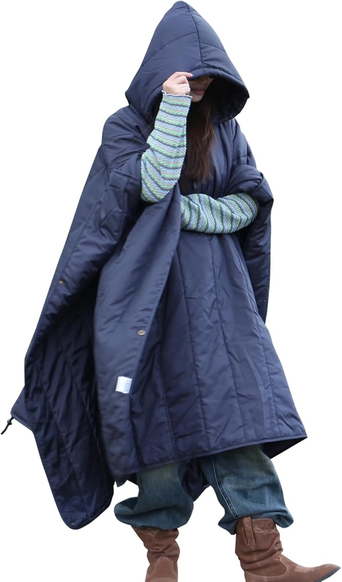 DUKUSEEK Outdoor Wearable Camping Blanket with Hood, Large Packable Backpacking Hooded Stadium Blankets, Lightweight Warm Quilt for Picnic, Hiking, Football, 79"X56"