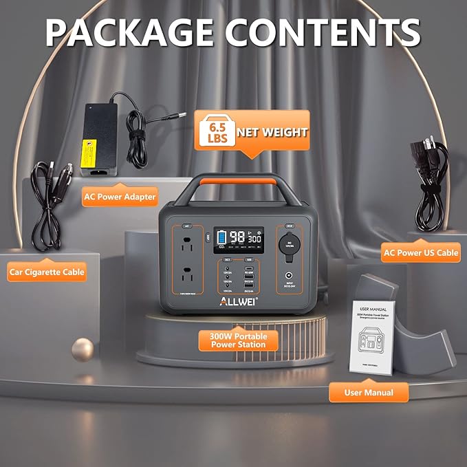 - 【Package Included】1x ALLWEI 300W Portable Power Station, 1x ALLWEI 100W Solar Panel built-in 5521 MM, 1x AC Power Adapter, 1x AC Cable, 1x DC Car Cable, 1x User Manual.