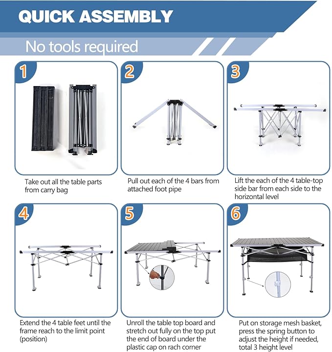 - 【Easy Assembly and Storage】The camping table has a tabletop size of 21.65 x 50.39 inches and is equipped with a mesh bag and an external bag, making it easy to carry and transport, suitable for outdoor adventures. It can be set up and dismantled quickly and easily, saving valuable time during camping