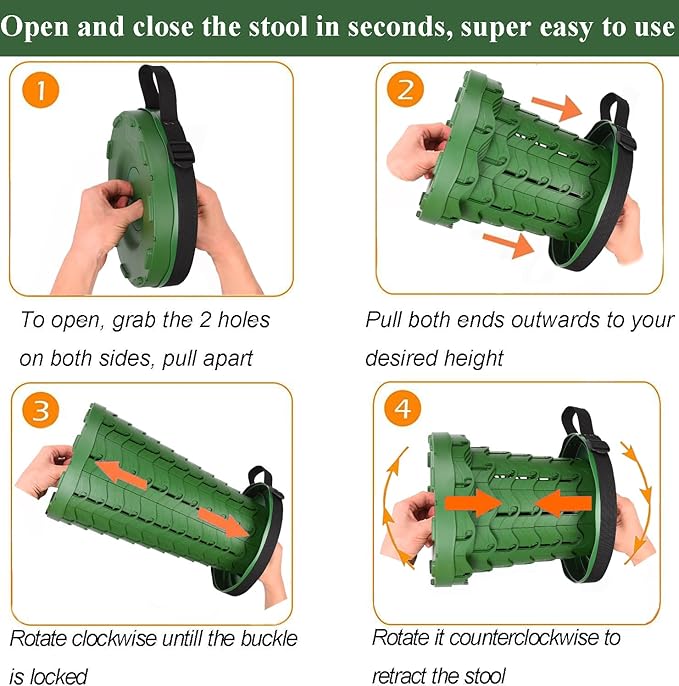 - [Self-Open Prevention]: When this collapsible stool is closed, snap joints designed on the caps come into play to prevent the stool from opening by itself. This make it more convenient and easier to bring it along for outdoor activities, the non-slip base ensure that this collapsible stool gets the stability to provide safety and comfortable sitting