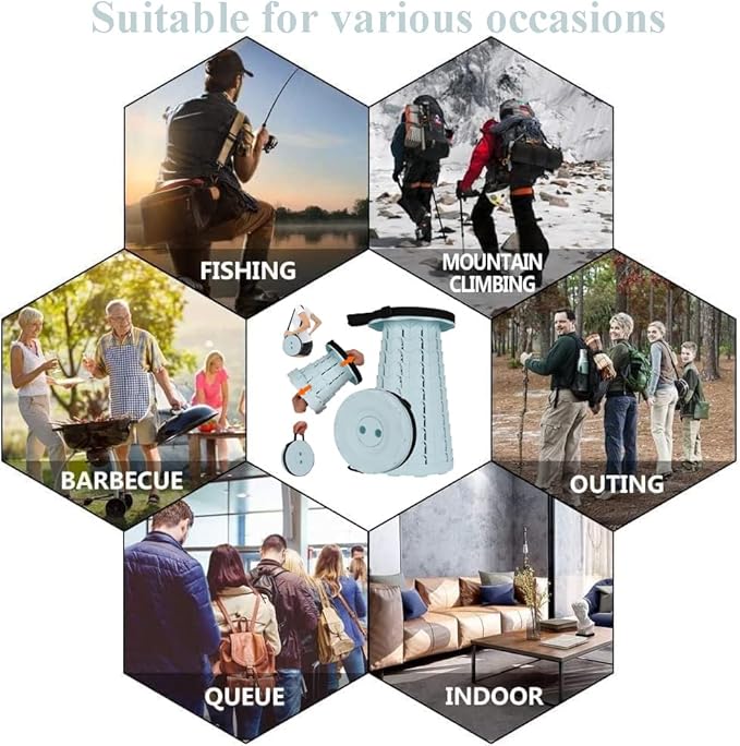 - [Easy to use,Multipurpose]:super easy to use.You can open the collapsible stool by holding both ends and pulling to open with slight turning them,perfect for indoors and outdoors.Indoor occasions such as the living room, bedroom,bathroom,kitchen,office.Outdoor activities:drawing room,garden,hiking,BBQ,camping,queue,fishing, kitchen, etc