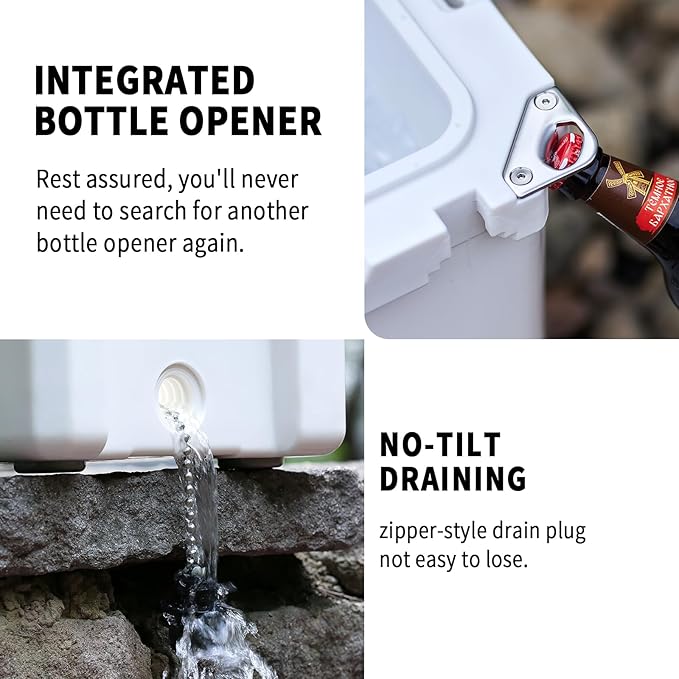 - QUALITY MATERIALS: Crafted with seamless LLDPE using rotomolding technology, our coolers feature UV-resistant exteriors and food-safe interiors. The impact-resistant, one-piece design withstands extreme outdoor abuse while maintaining structural integrity - no cracks, leaks, or warping under 310+ lbs weight capacity.
