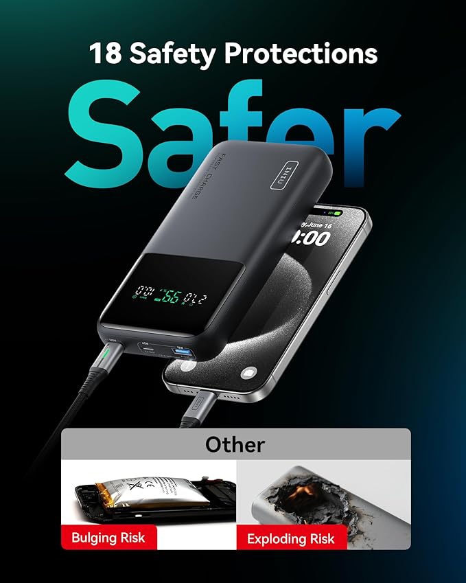 - Charge 3 at Once: With 3 charging ports, including a blazing-fast PD 3.1 140W USB-C in/out port, a PD 45W USB-C fast charging port, and a trusty USB-A port, this power bank is your all-in-one charging solution. It works seamlessly with various cable types, ensuring rapid charging for all your devices.