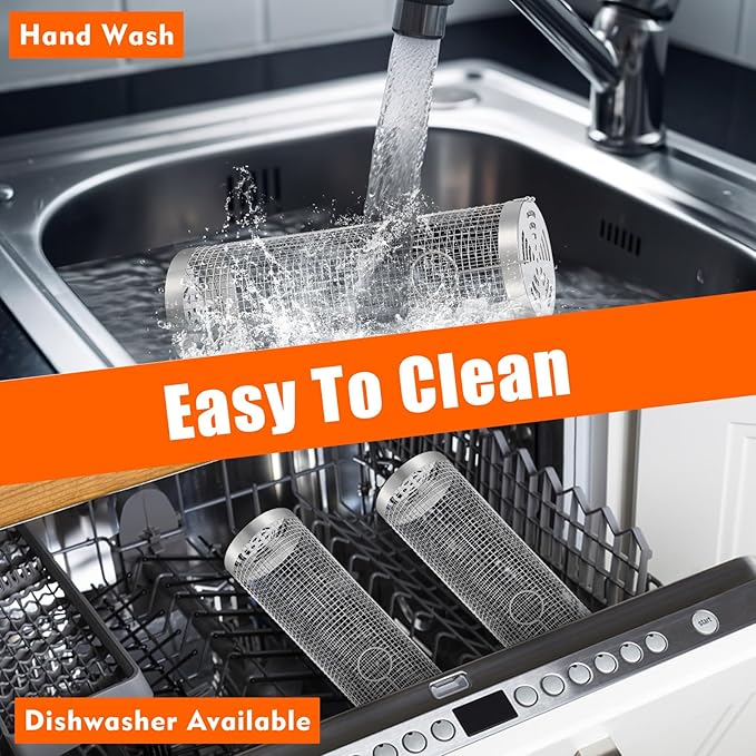 - 【Easy to Cleaning】Rolling grill baskets easy to cleaning, dishwasher or hand washing, It supports dishwashers and hand washing, If you want to add shine to it, you can soak the Grill BBQ Net tube with cleaning supplies in advance, then use a wire brush (preferably a wire brush with a handle for safety) to simply brush it or rinse it with a high-pressure water gun, then rinse it with clean water and let it dry.