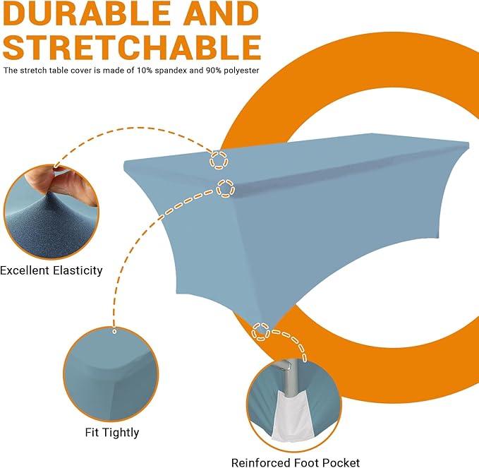 - DURABLE & SPANDEX: The stretch spandex rectangular table cover was made from 10% Spandex, 90% Polyester material, wrinkle and stain resistant stretch spandex fabric with a 200 GSM, which make tablecloth more stretchable and durable, does not require ironing and can be laundered countless times.