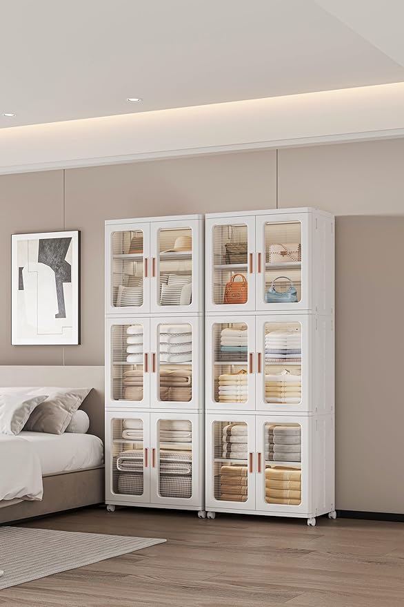 Storage Bins with Lids and Doors Storage Cabinet with Wheels Plastic Stackable Pantry Cabinet Cupboard Closet Foldable Kitchen Collapsible Storage Bins for Book Snack and Bathroom Organizer
