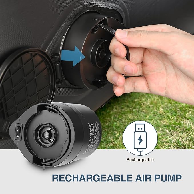 - Rechargeable Air Pump: Built-in electric air pump which is rechargeable and re-moveable. It can be used separately for other inflatables