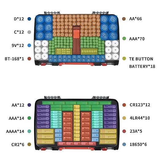 - Unique double sided battery box: Battery storage case front side holds 70 *AAA 3A, 66*AA 2A, 12*D, 12*C, 12*9 Volt, 18*3v lithium coin cell batteries,1*battery tester vertically, back side holds 14*AAA, 14*AAAA 4A, 12*AA,6*18650, 6*CR2, 12*CR123A, 10*4LR44, 5*23A various odd sizes flat. Battery caddy perfectly fits for Duracell/ for Energizer Alkaline/ for ACDelco/ for Panasonic