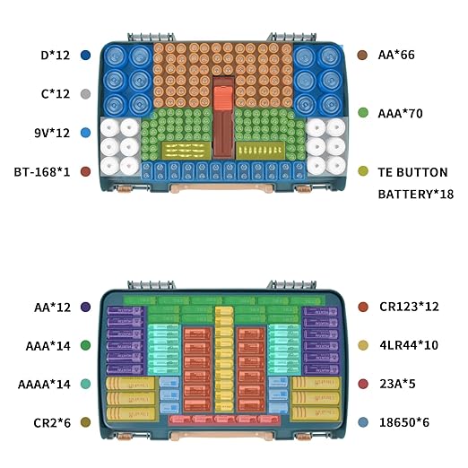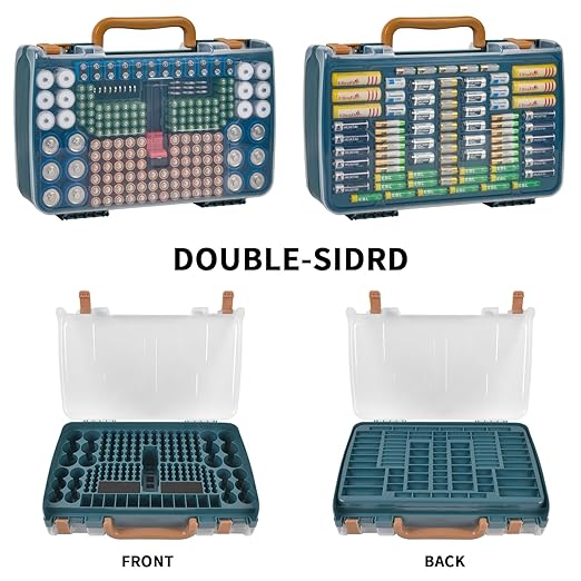 - Unique double sided battery box: Battery storage case front side holds 70 *AAA 3A, 66*AA 2A, 12*D, 12*C, 12*9 Volt, 18*3v lithium coin cell batteries,1*battery tester vertically, back side holds 14*AAA, 14*AAAA 4A, 12*AA,6*18650, 6*CR2, 12*CR123A, 10*4LR44, 5*23A various odd sizes flat. Battery caddy perfectly fits for Duracell/ for Energizer Alkaline/ for ACDelco/ for Panasonic