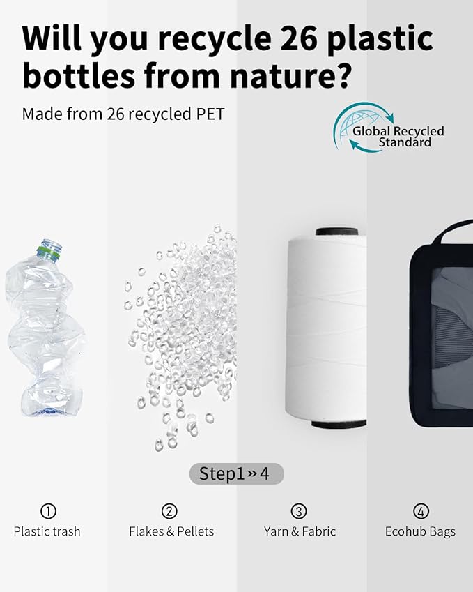 - 【SUSTAINABLE AND GUARANTEE】: ECOHUB travel packing cubes are made from at least 50% recycled materials, with fabric and lining crafted from 26 recycled PET plastic bottles. The lightweight fabric combined with YKK zippers and reinforced ripstop stitching, ensure durability for any adventure. If you have any concerns, reach out through your order. (Patent Pending)