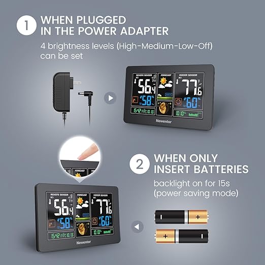 - [7.5" LCD Screen Weather Stations] Newentor temperature&humidity monitor with large color display, which shows comprehensive information: inside outside temperature humidity(max/min, hi/lo), customizable alerts, time/date, alarm clock/snooze, weather forecast (next 8-24 hrs) moon phase, barometric pressure.