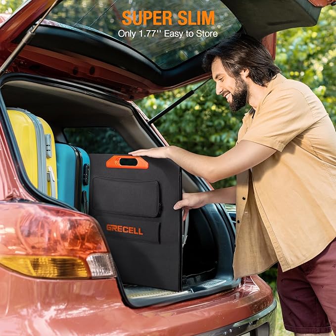 - Portable & Super Slim: With a folded size of 21.46*22.95*1.77 inches and a lighted weight of only 10.14lbs, the GRECELL UB200 is 30+% lighter than other 200W solar panels and more portable with one hand. With super slim unfolded thickness:0.98inch, it will not take up much space when stored or used. 4 adjustable kickstands, 4 metal reinforced mounting holes to help you fold/hold/hook it up anywhere. Tips: For best results, we recommend using GRECELL solar panels with GRECELL solar generators.