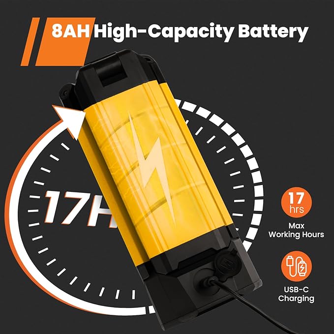 - Cordless Design & 8 AH High Capacity Battery - Amazingly 8 AH Battery supports longer working hours per charge. The max working hours under low-brightness mode is approximately 17hrs, which is sufficient for multiple outdoor activities. USB-C port functioning convenient charging with TYPE-C cable. The cordless design of this work light gives you more portability While working. Giving you more freedom of use, no mater indoor or outdoor