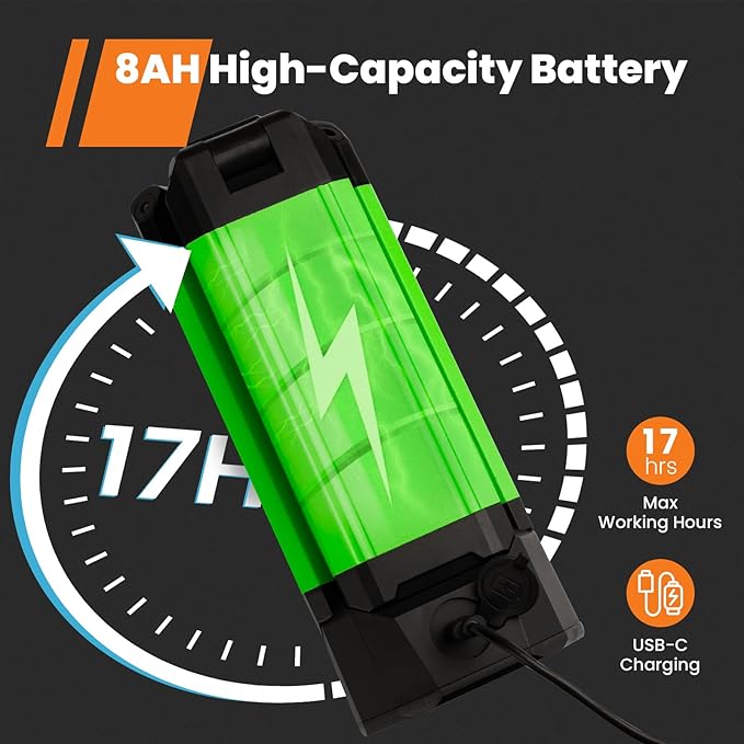 - Cordless Design & 8 AH High Capacity Battery - Amazingly 8 AH Battery supports longer working hours per charge. The max working hours under low-brightness mode is approximately 17hrs, which is sufficient for multiple outdoor activities. USB-C port functioning convenient charging with TYPE-C cable. The cordless design of this work light gives you more portability While working. Giving you more freedom of use, no mater indoor or outdoor