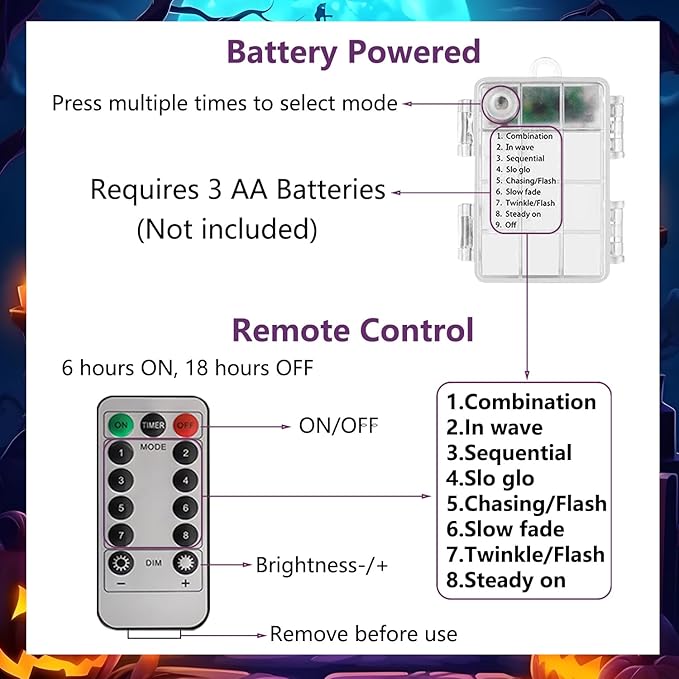- 2.String Lights with Remote Control - Point the remote to the string lights, you can control the lights ON, OFF and lighting modes. And there are 8 different modes (combination, sea wave, sequence, Slo-Glo, chase/flash, slow fade in, blink/flash, steady light up) can be controlled by the button on the battery box.