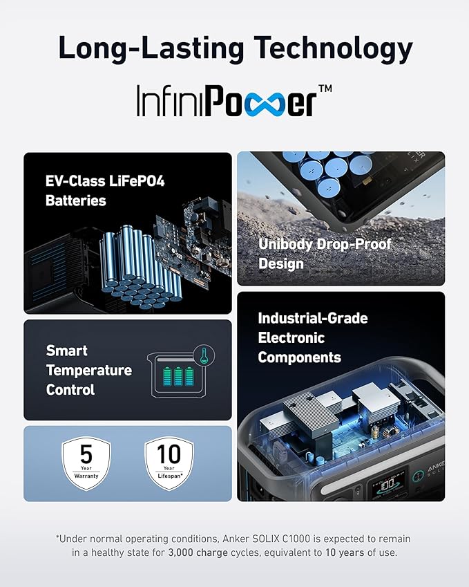 - 10-Year Lifespan, 3,000 Battery Cycles: Anker SOLIX C1000 is built to last with over 3,000 battery cycles. So power up, day after day, for 10 years.
