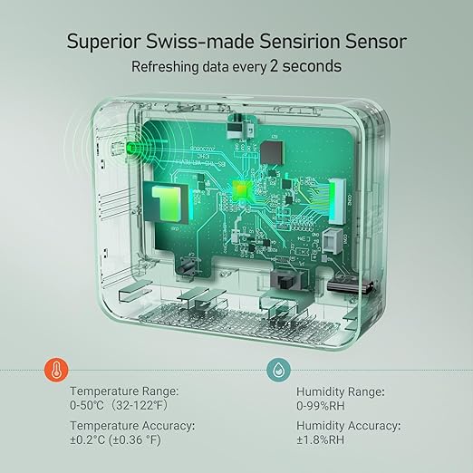 - 【High Precision Sensor】: The WiFi temperature monitor uses an advanced Swiss-made Sensirion sensor that quickly refreshes data every 2 seconds. Temperature accuracy: ±0.36°F/±0.2°C; Humidity accuracy: ±1.8%RH.