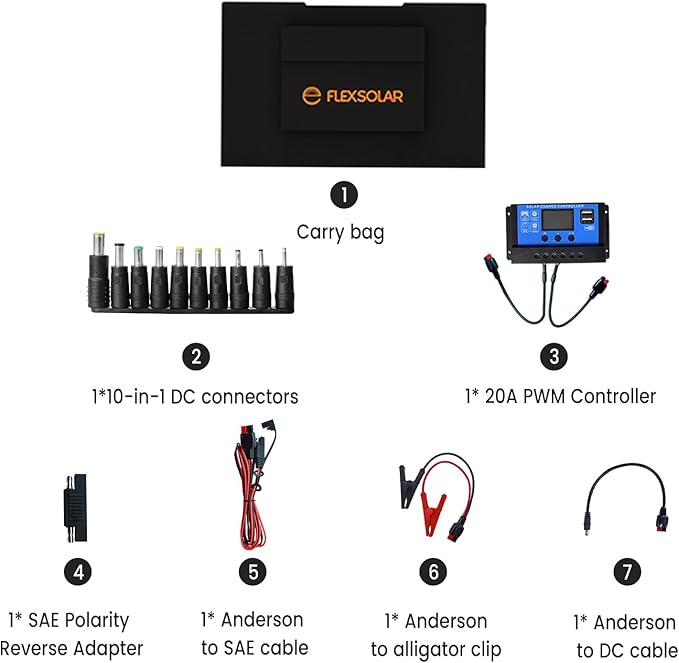 - 【What You Will Get】You will get 1 * 120W FlexSolar solar panel charger, 1 * 20A (12V/24V) PWM solar charger controller, 1* Anderson to DC5521 Cable, 1* 10-in-1 DC interchangeable connectors, 1* Anderson to alligator clip cable, 1*SAE Polarity Reverse Adapter Connector and 1* User manual. NOTE: Solar panel charger can't store the electricity, it converts sunlight directly into electricity and output it to your electronic devices immediately! Cloud cover or coverage may affect the charging speed, it is recommended to put this solar panel charger in direct sunlight.