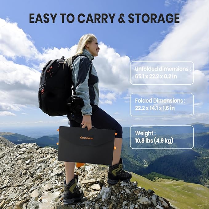 - 【Easy to Carry & Waterproof 】The solar panel charger with ultra compact of folded size 22.2x14.1x1.6in, unfolded size 65.1 x 22.2 x 0.2 in, only 10.8lbs with junction box and accessories, and it comes with a rubber handle that makes it easy to carry anywhere you go. IP65 water-resistant that will protect from water splashing, endure for any weather conditions, it is a good companion for your outdoor adventure.