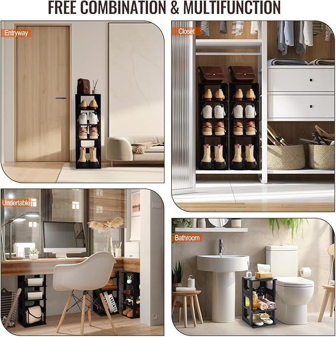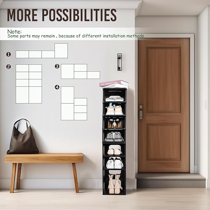 - Space Saving: This 8-tier narrow shoe rack maximizes every inch of your valuable space in closets, entryways, and floors. Its compact footprint (9.5" × 10") can hold up to 8 pairs of shoes