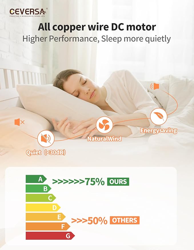 - 【Noiseless Reversible DC Motor】Ceversa ceiling fan with light use solid copper wires, which have superior conductivity compared to traditional AC motors. This enhances motor efficiency by over 50%, significantly reducing energy consumption and saving on electricity bills. With noise levels below 30 decibels, our motors are designed to last for over 15 years.